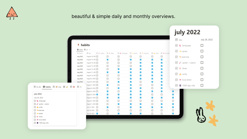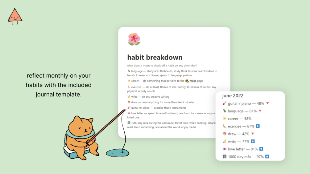 - ๐ journaling template: a simple template you can use to write down which habits you're focusing on, what's important, and how you've been doing with habits each month, if you're into that